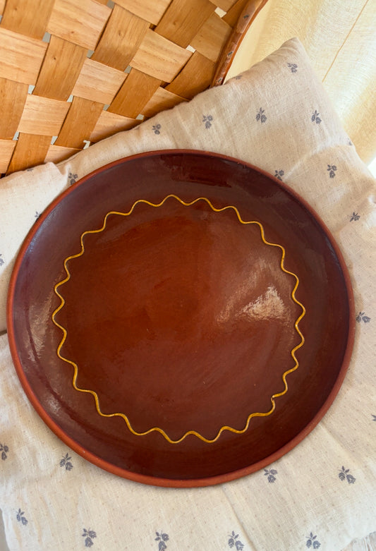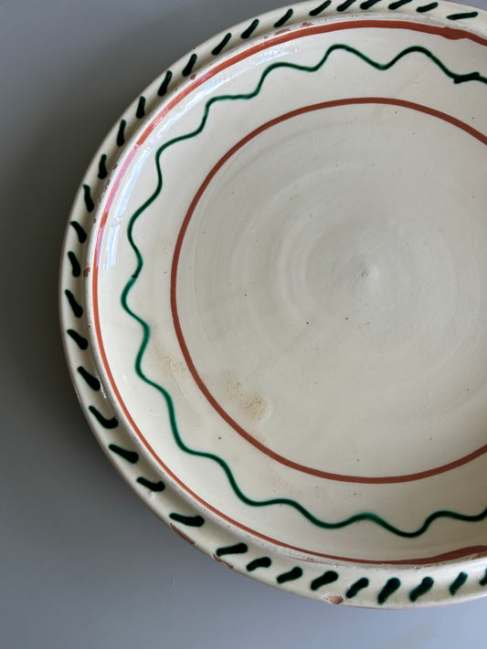 Rundt lerfad med grøn glasur