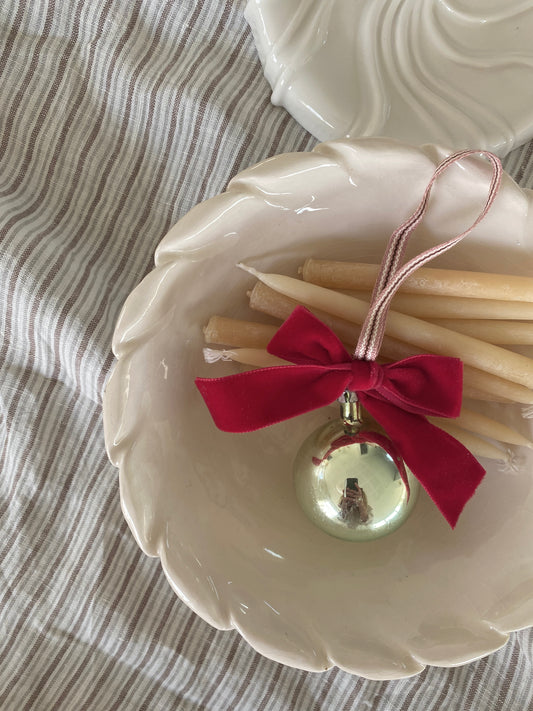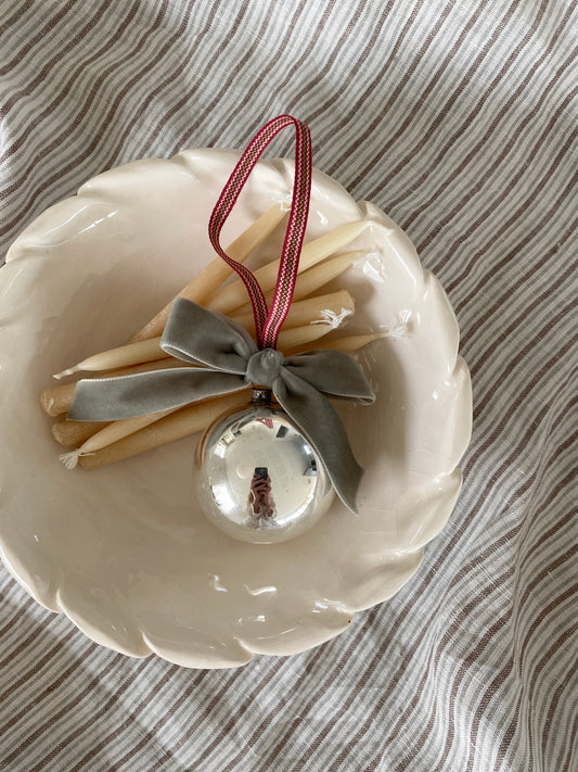 Vintage julekugle med sløjfe og bånd - beige/rød