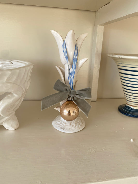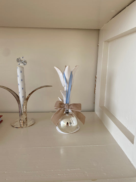 Vintage julekugle med sløjfe og bånd - beige/blå