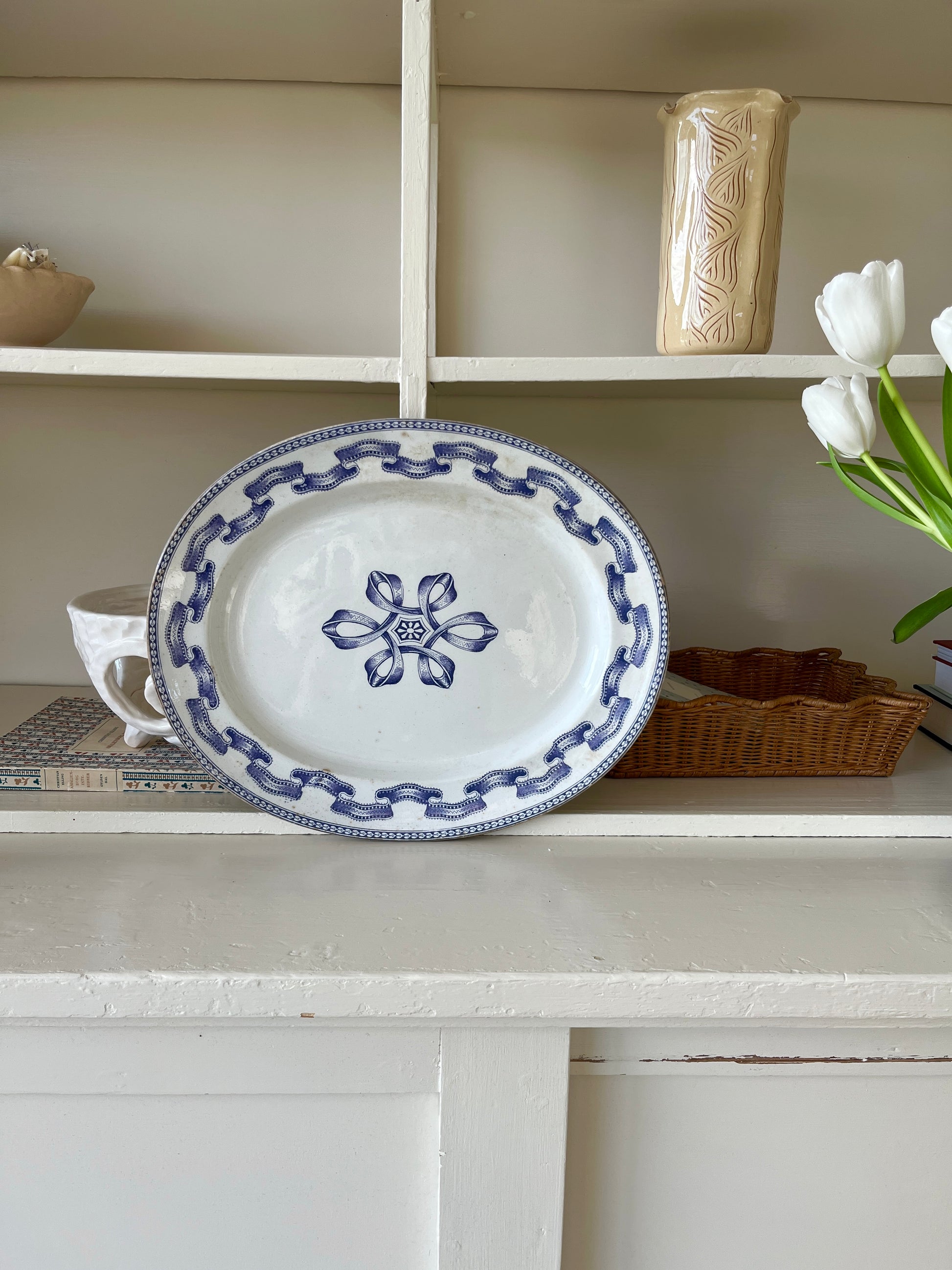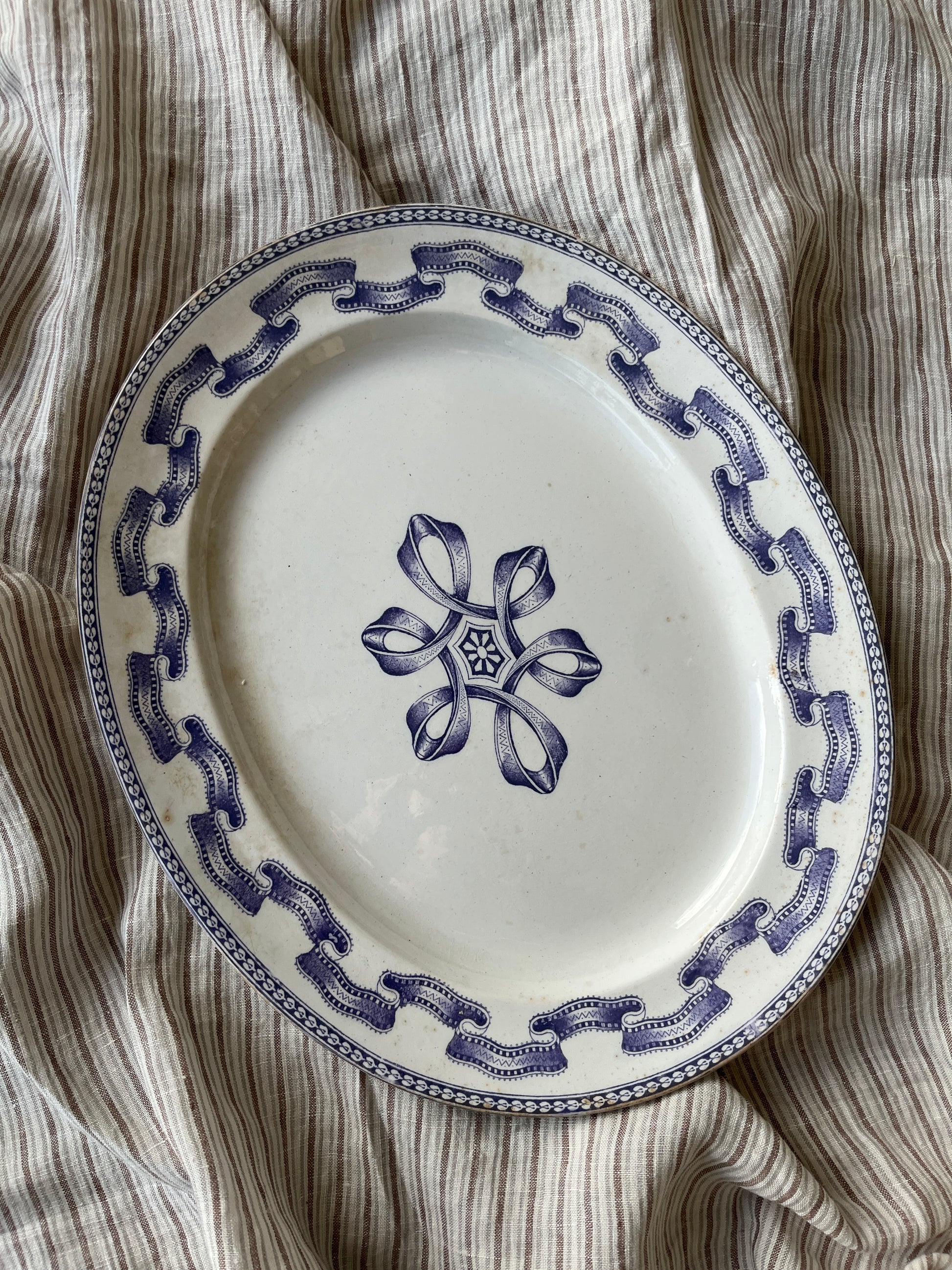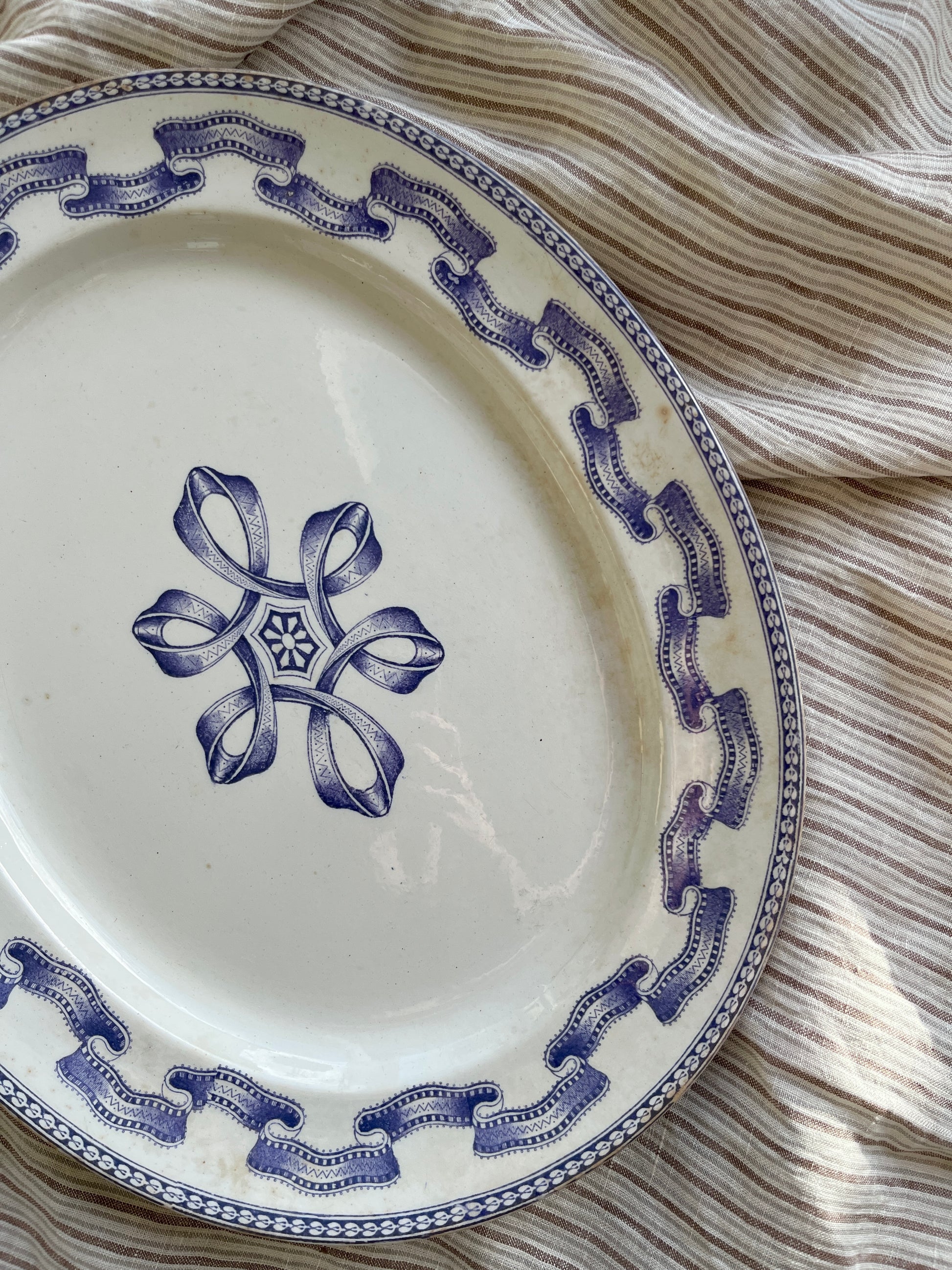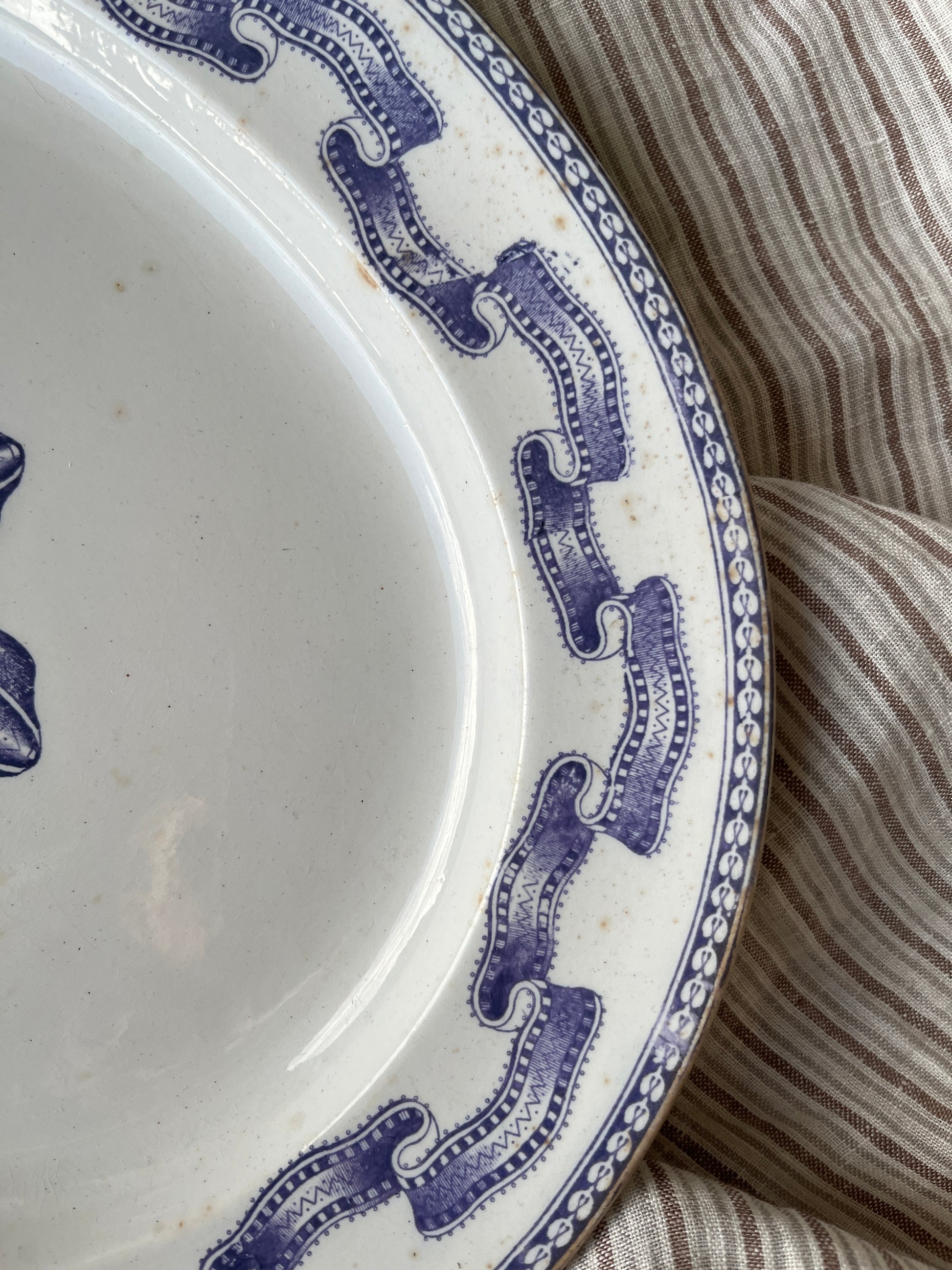 Smukt antikt patineret fad med lilla mønster.