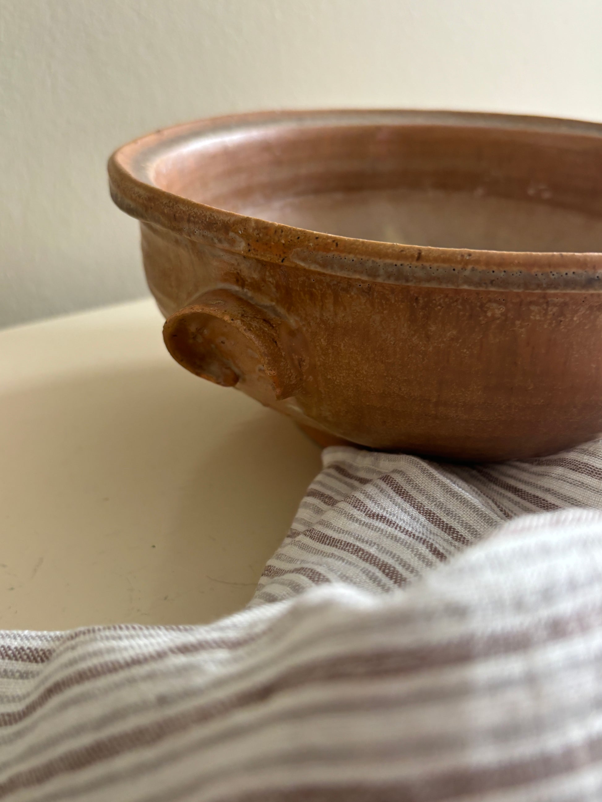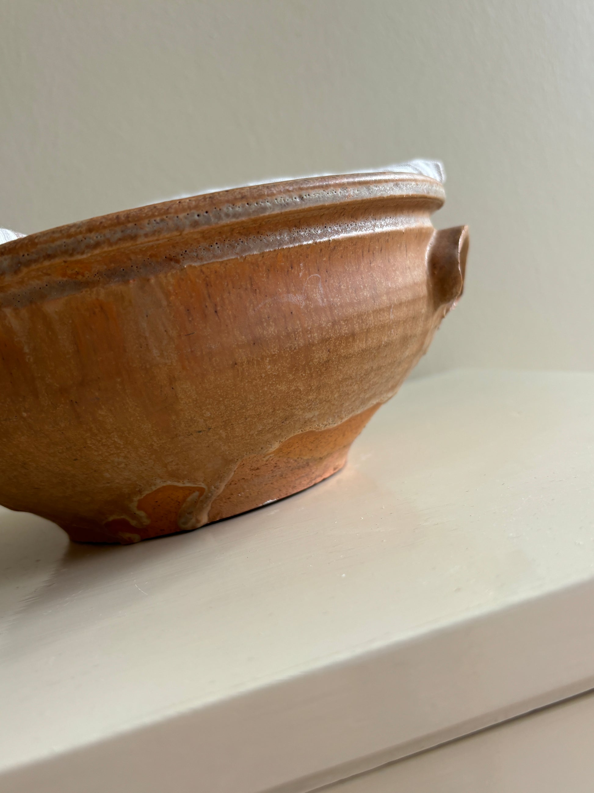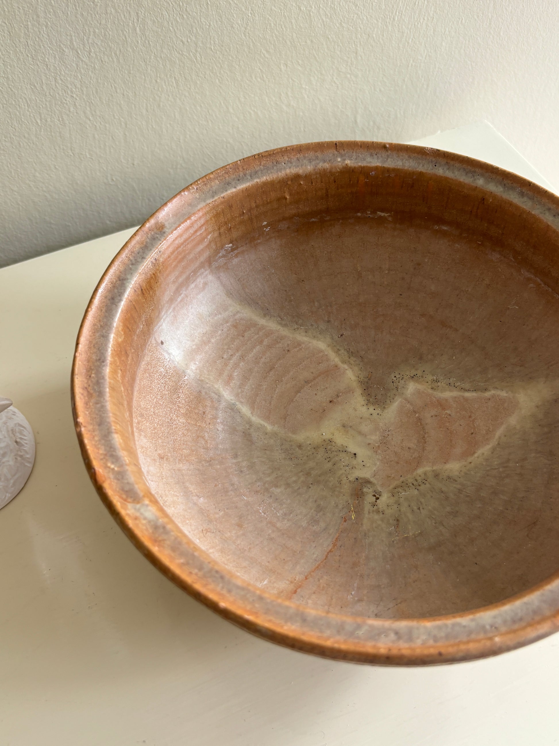 Fin brun keramik skål med håndtag. Glasuren variere inde i skålen.