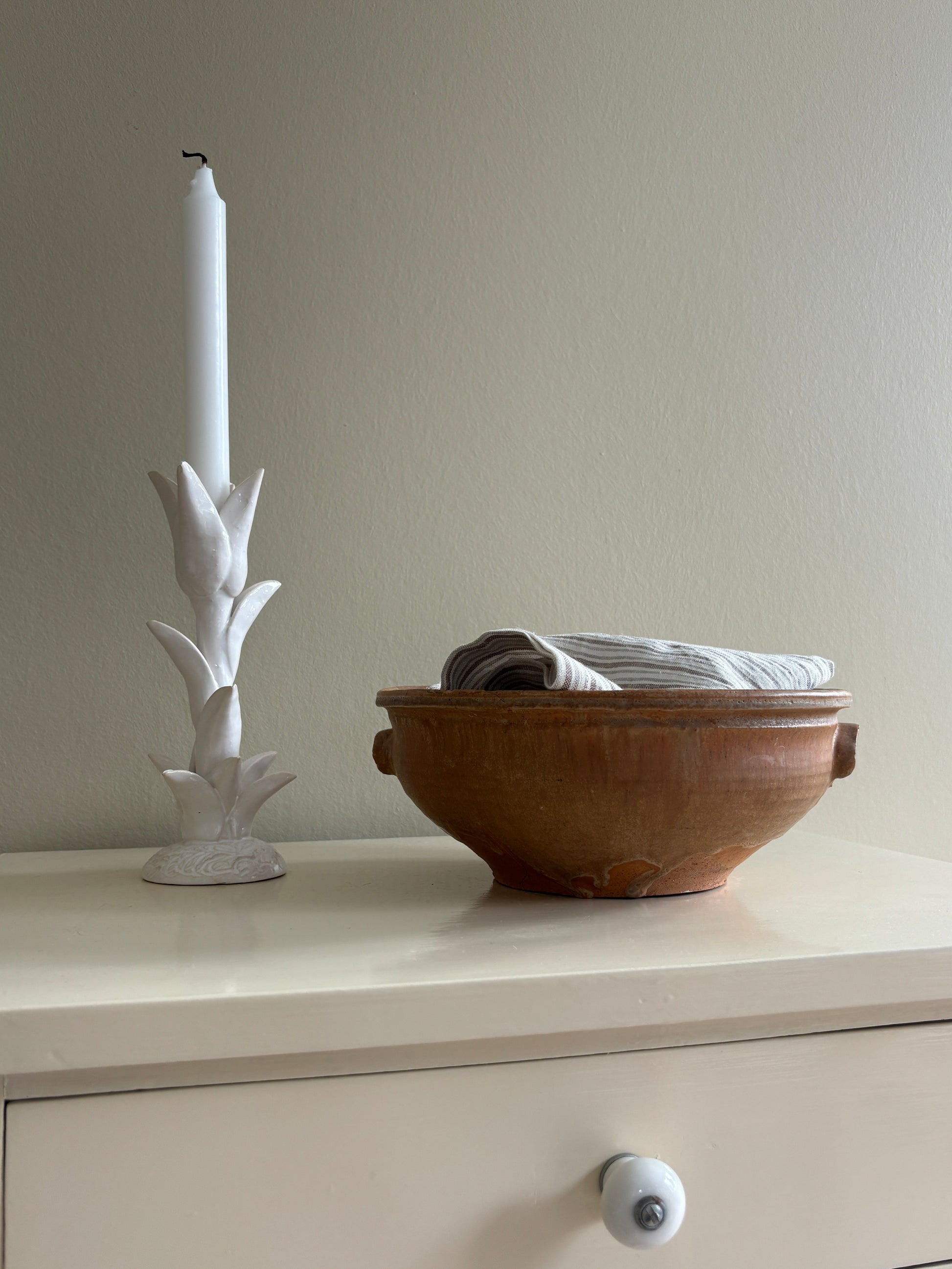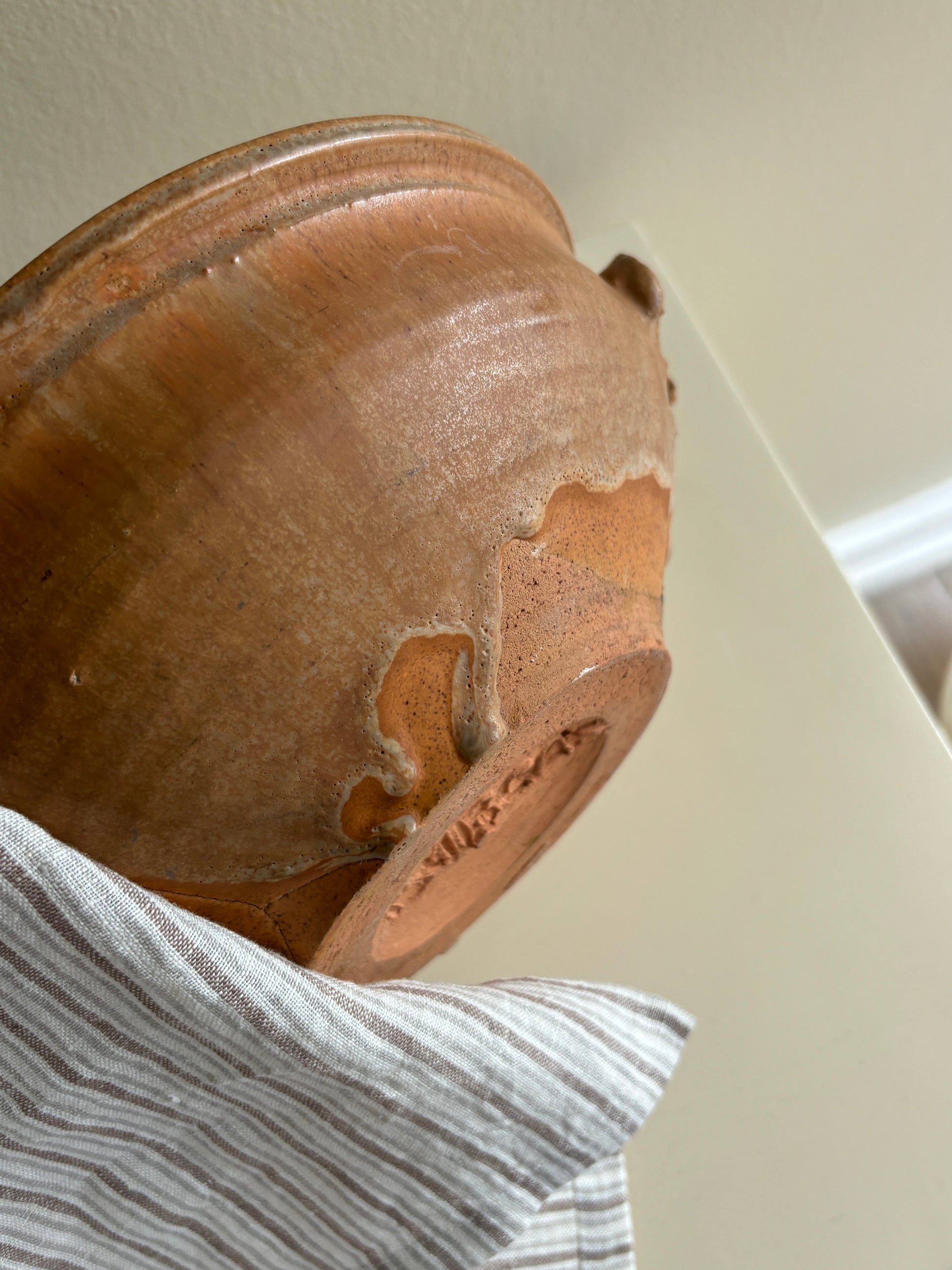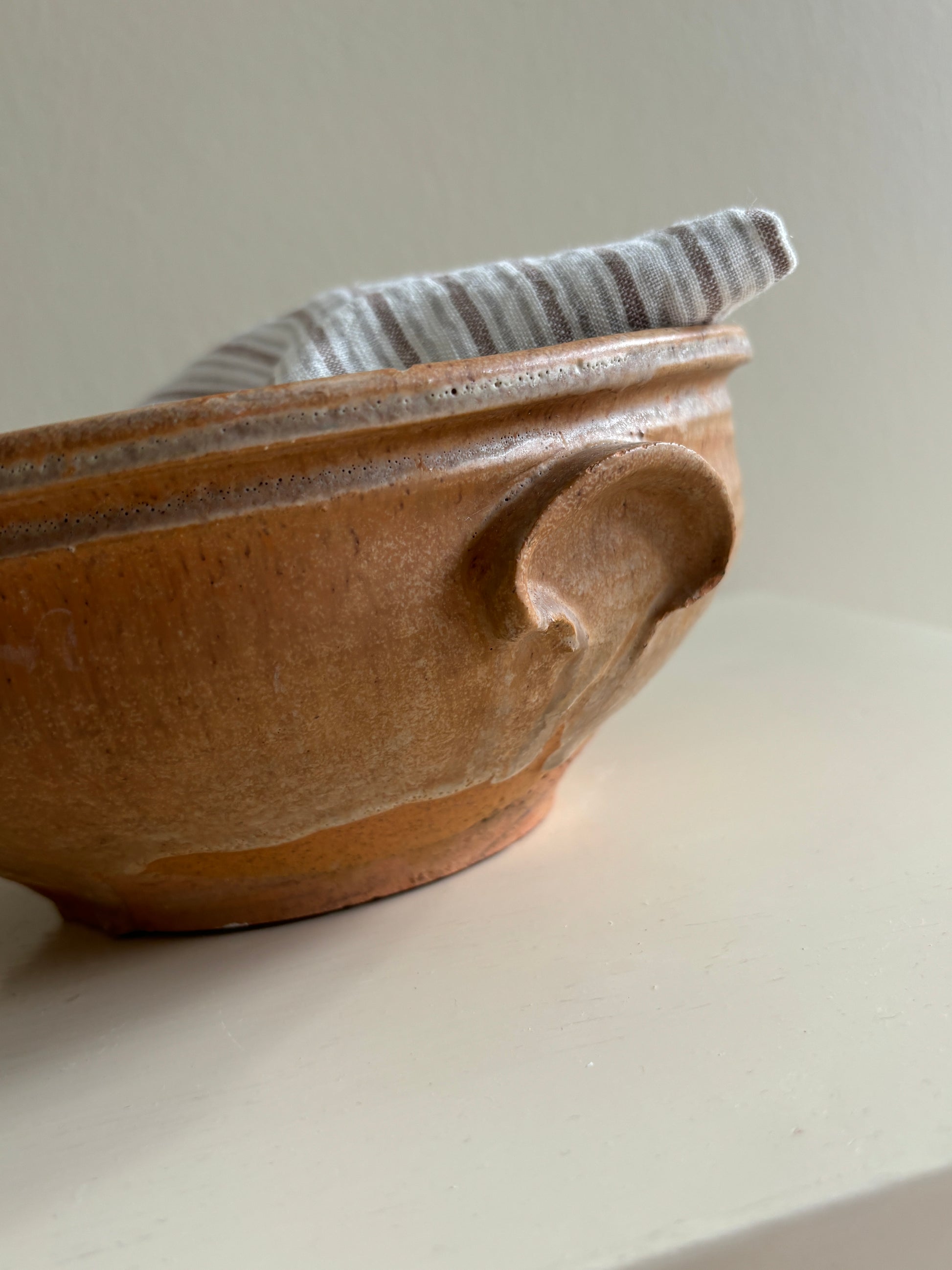Fin brun keramik skål med håndtag. Glasuren variere inde i skålen.