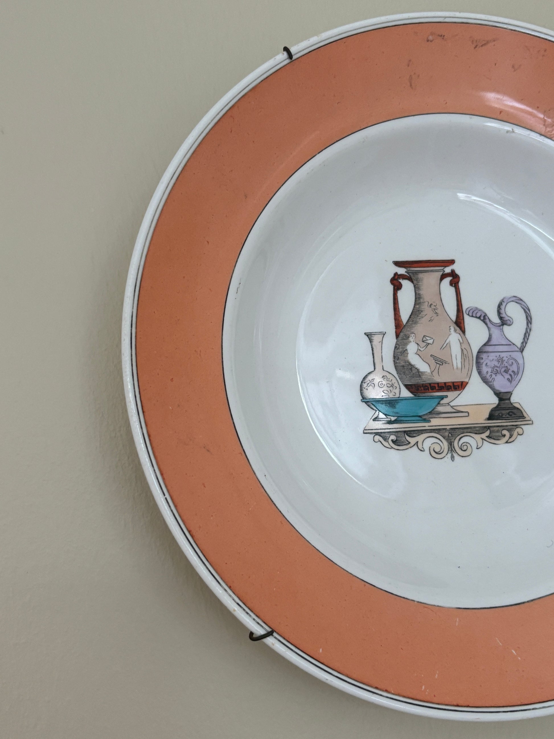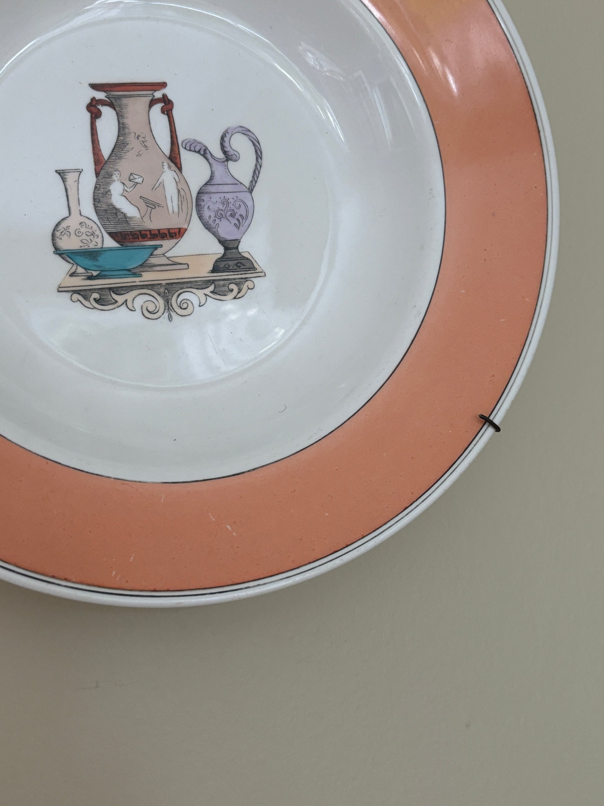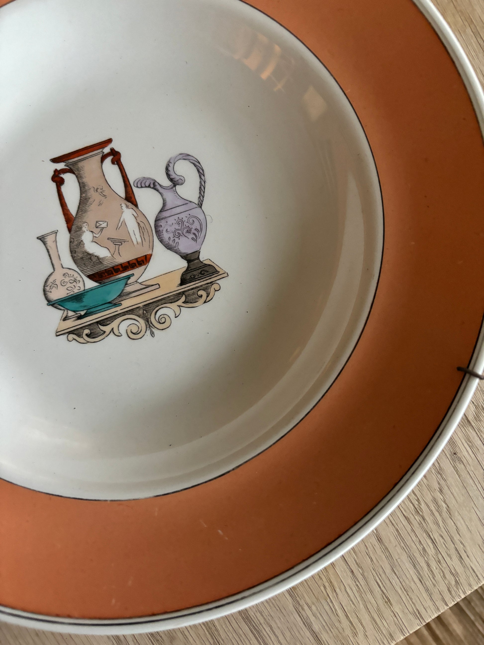 Smuk gammel platte med ferksenfarvet kant og fint motiv i midten