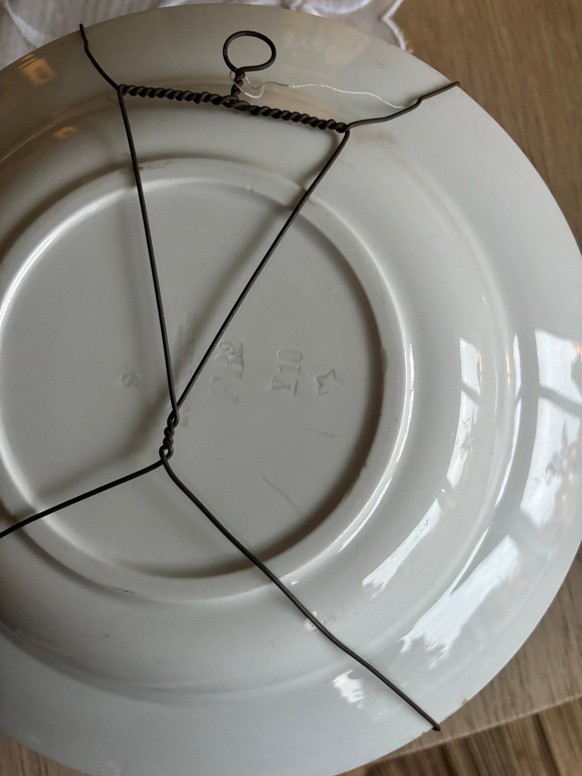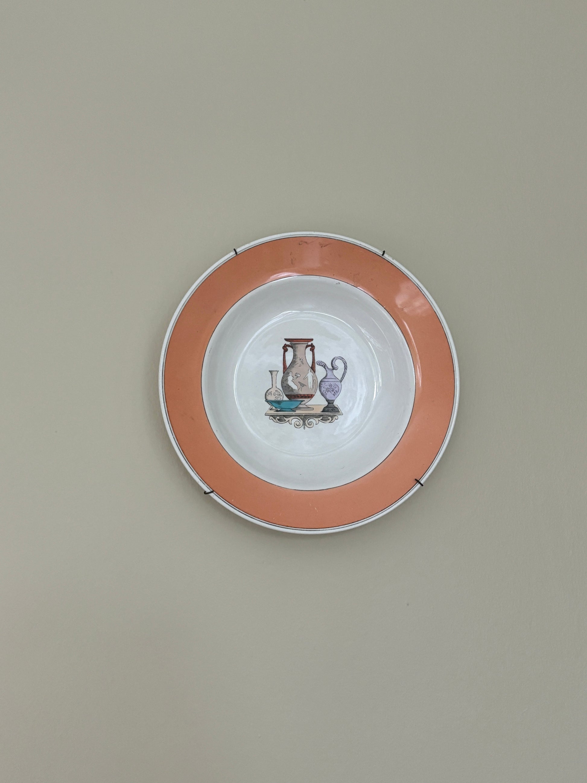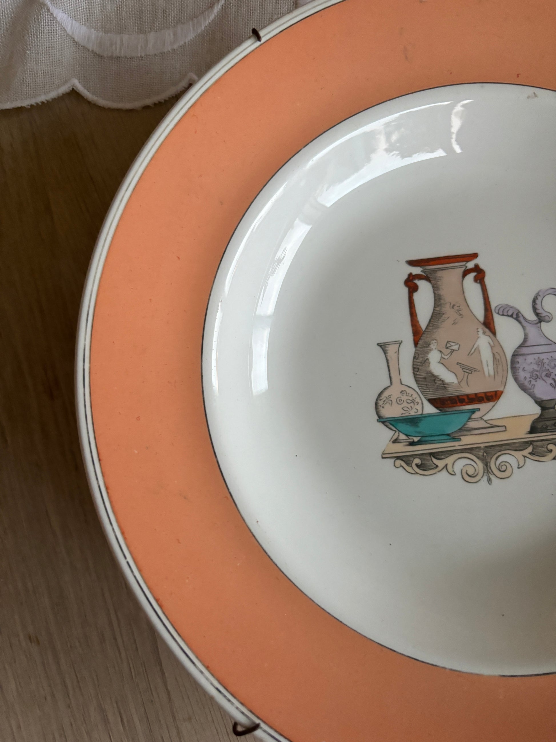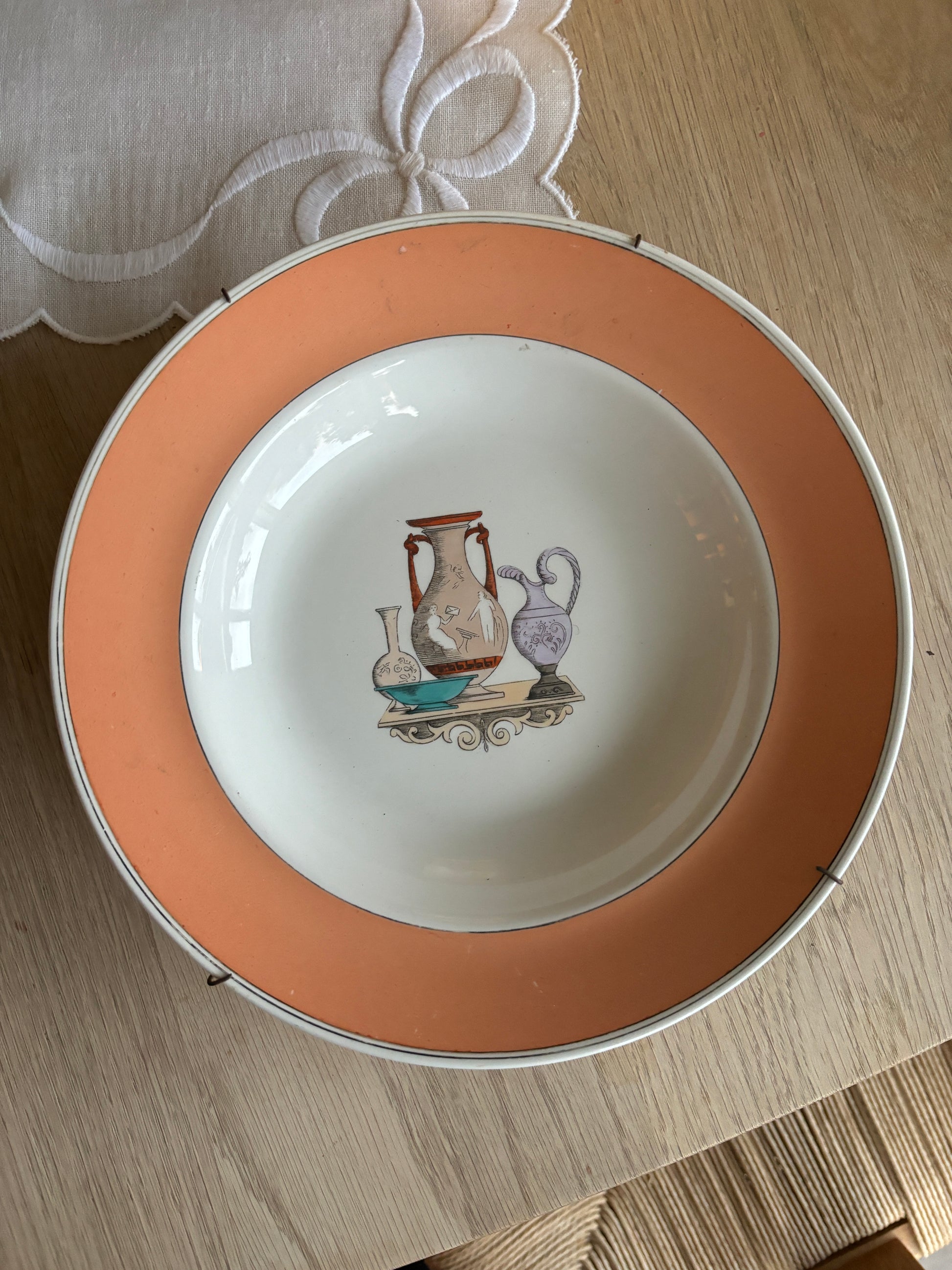 Smuk gammel platte med ferksenfarvet kant og fint motiv i midten