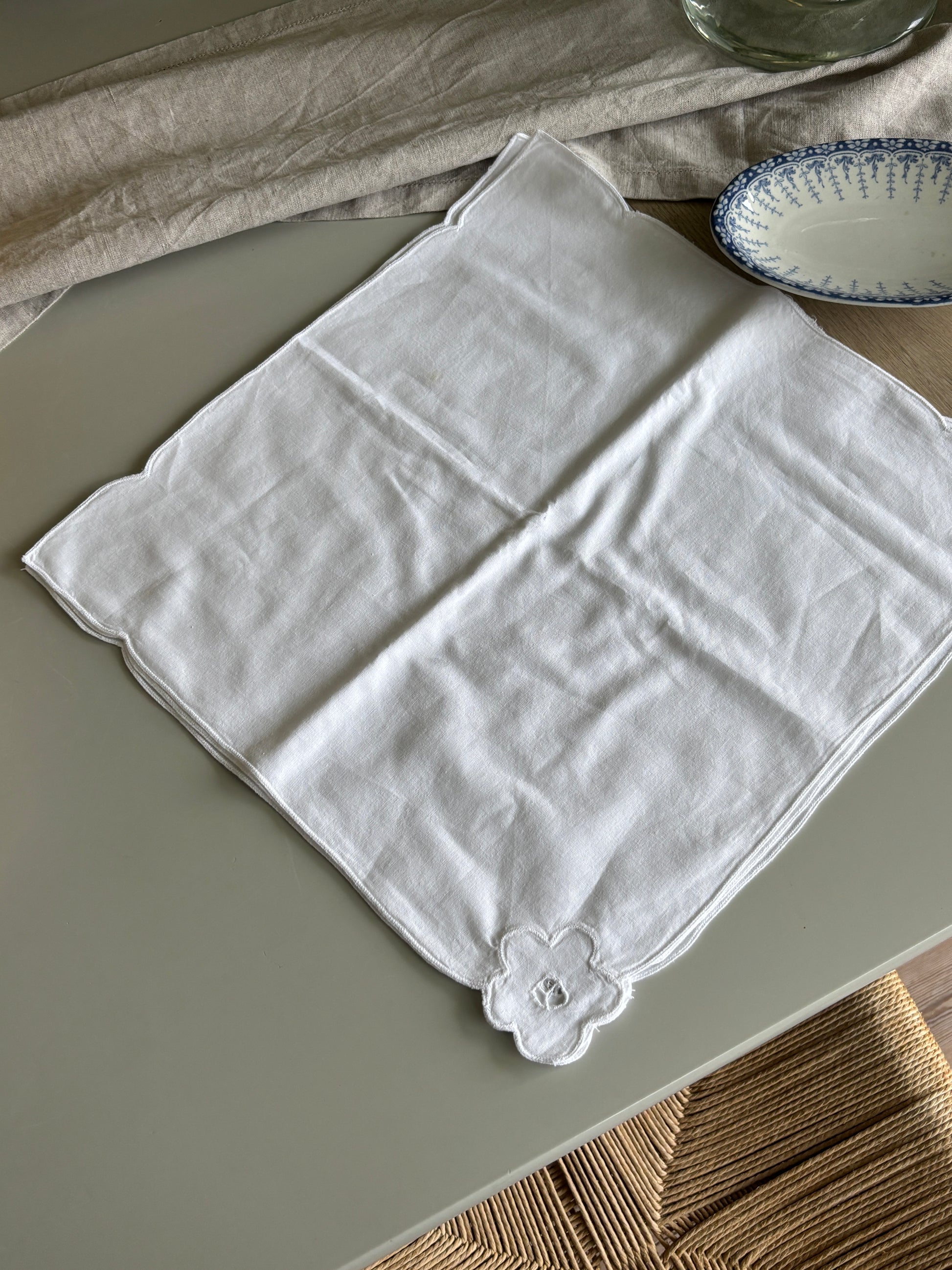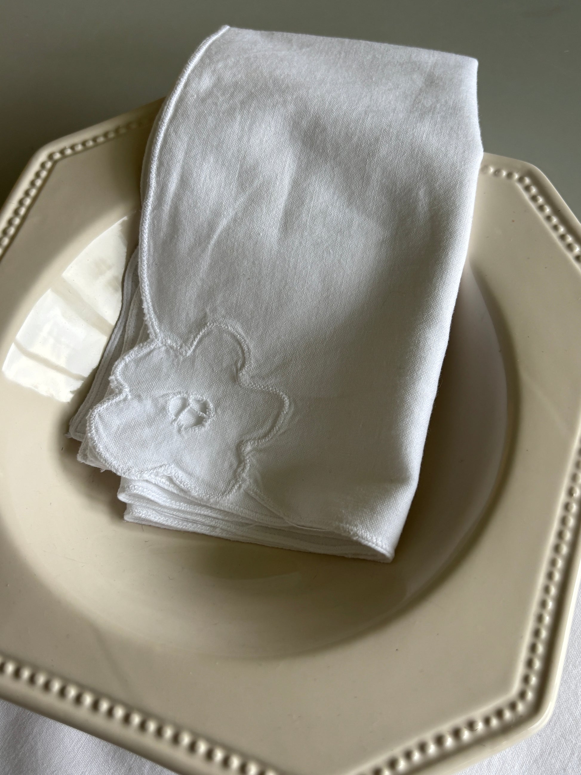 Smukke hvide servietter med blomst i hjørnet