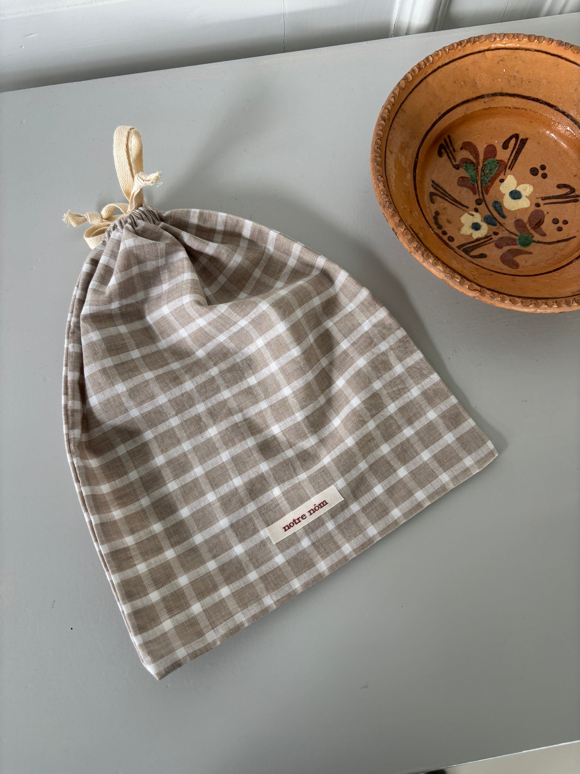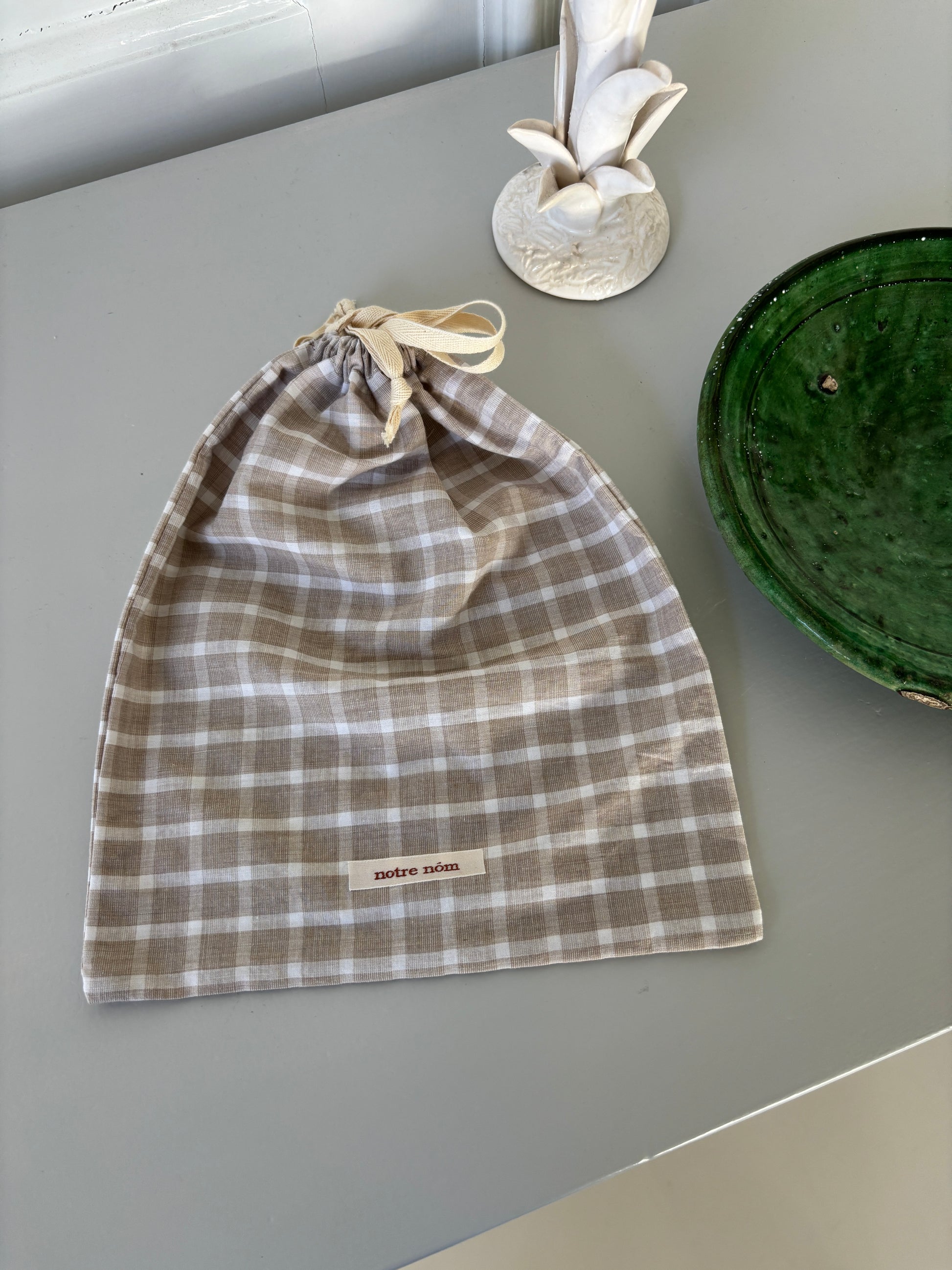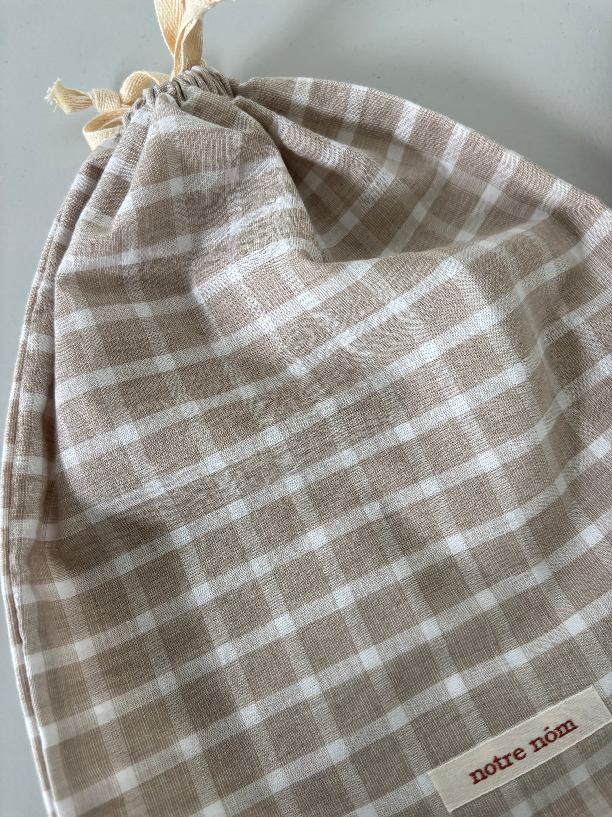 Håndlavet stofpose med snoreluk. I det fineste ternet stof.