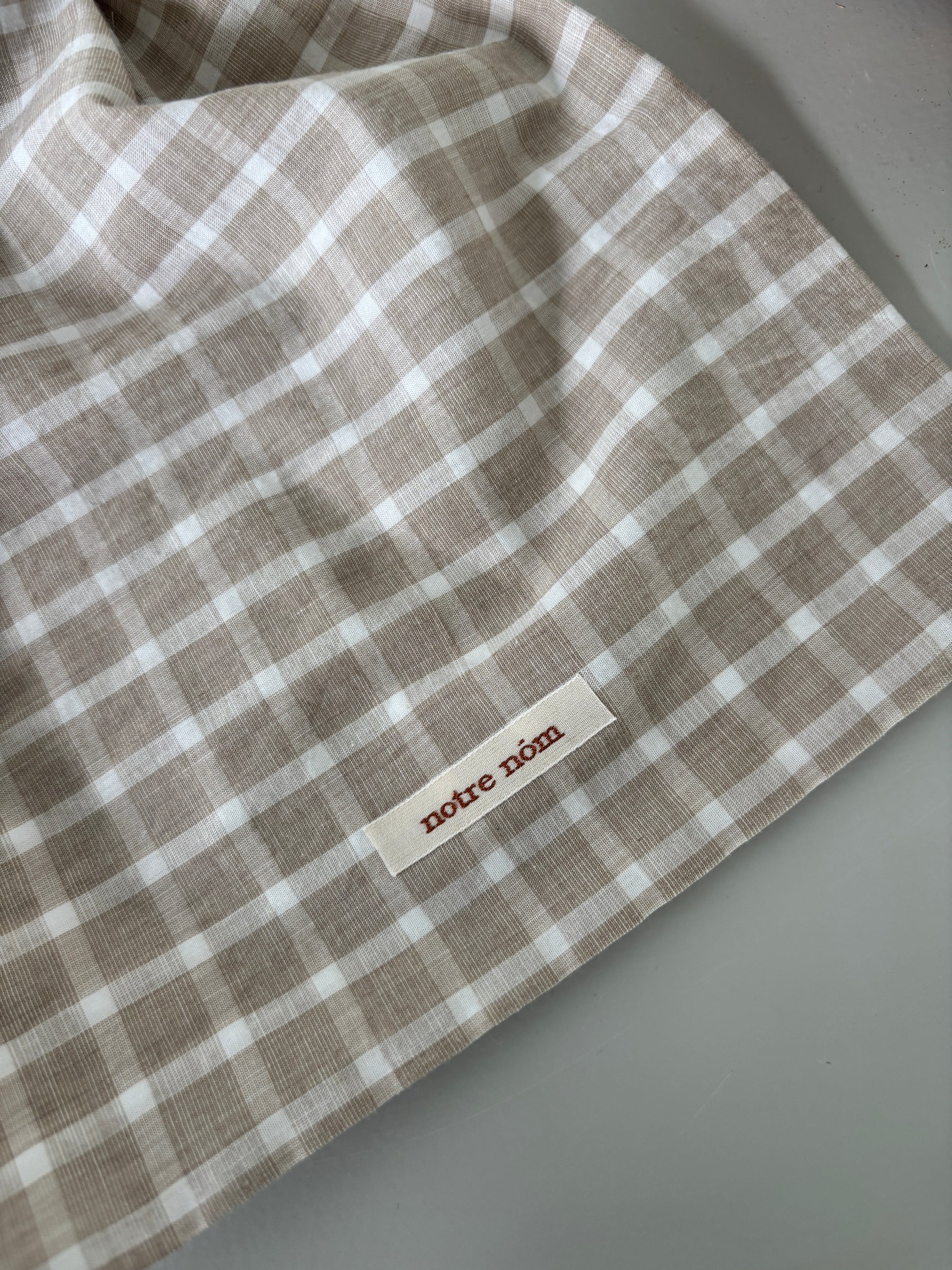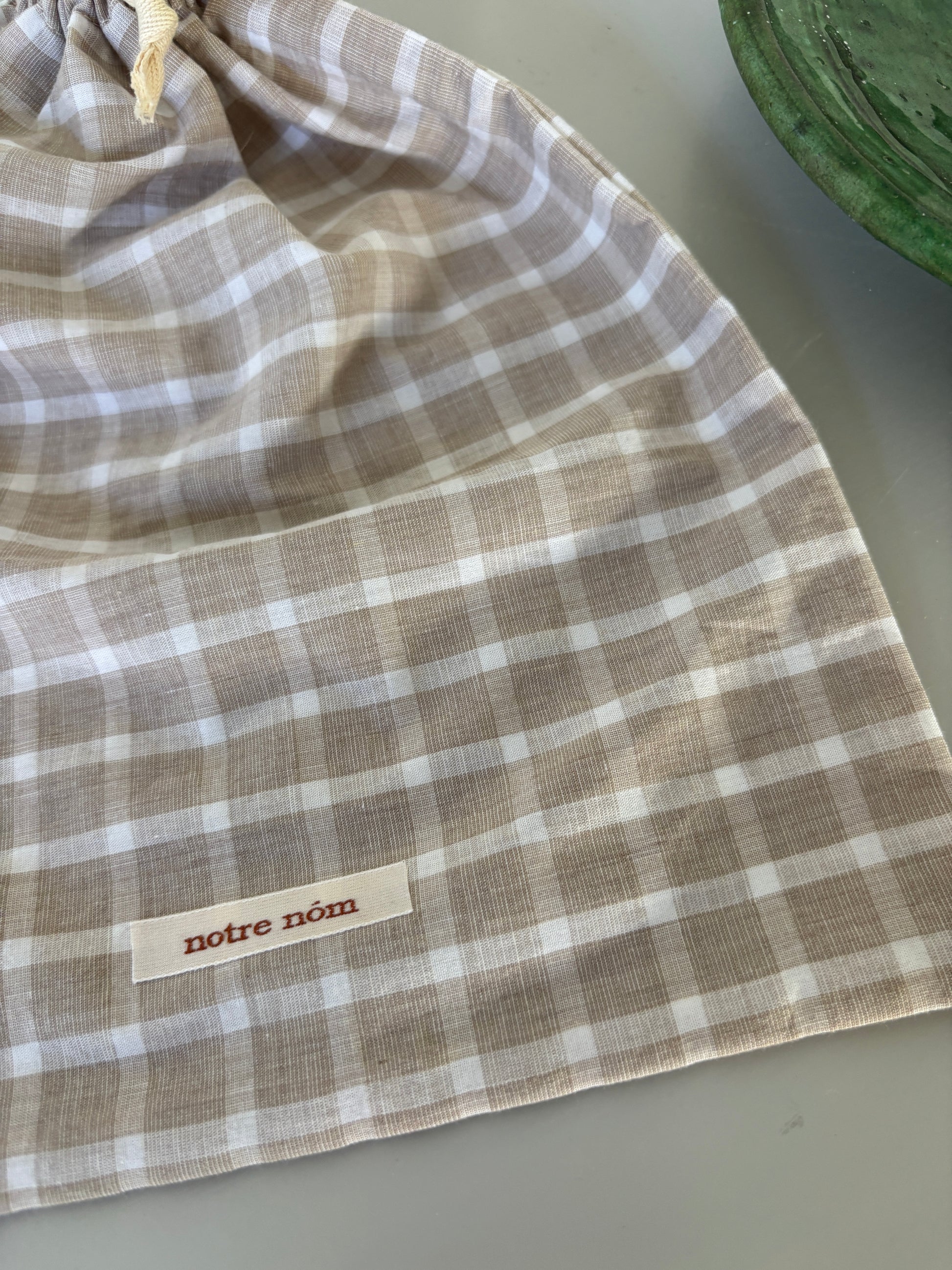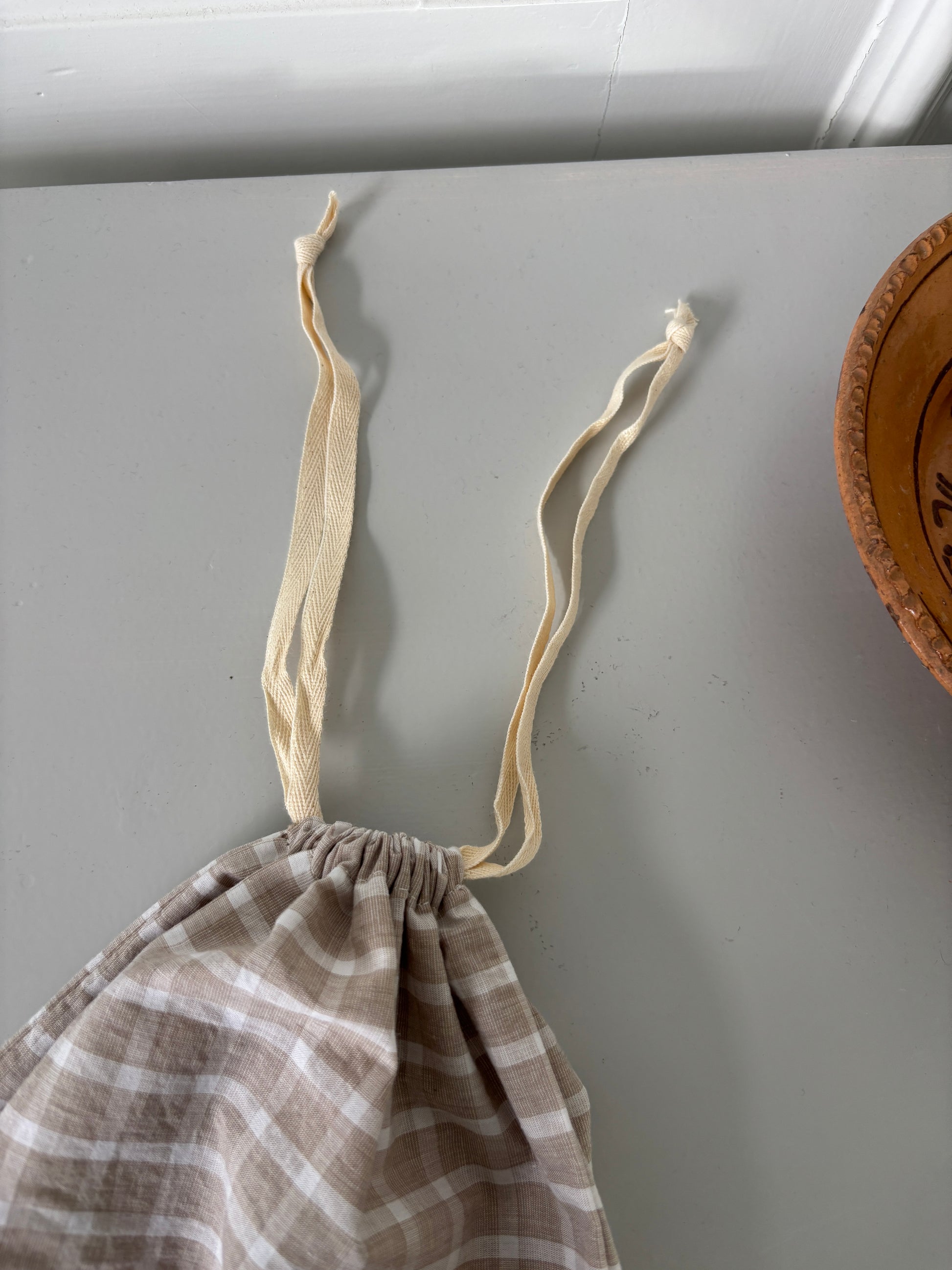 Håndlavet stofpose med snoreluk. I det fineste ternet stof.