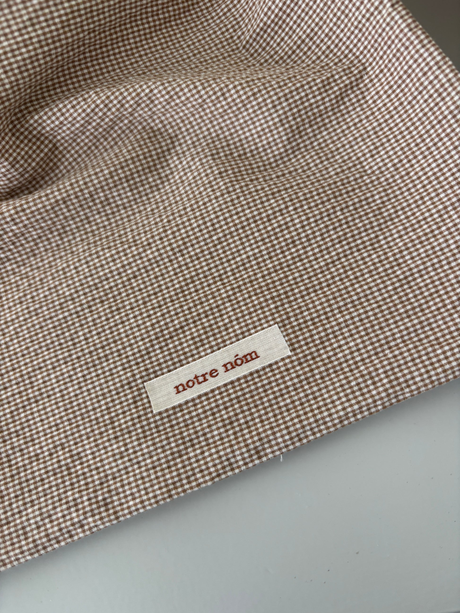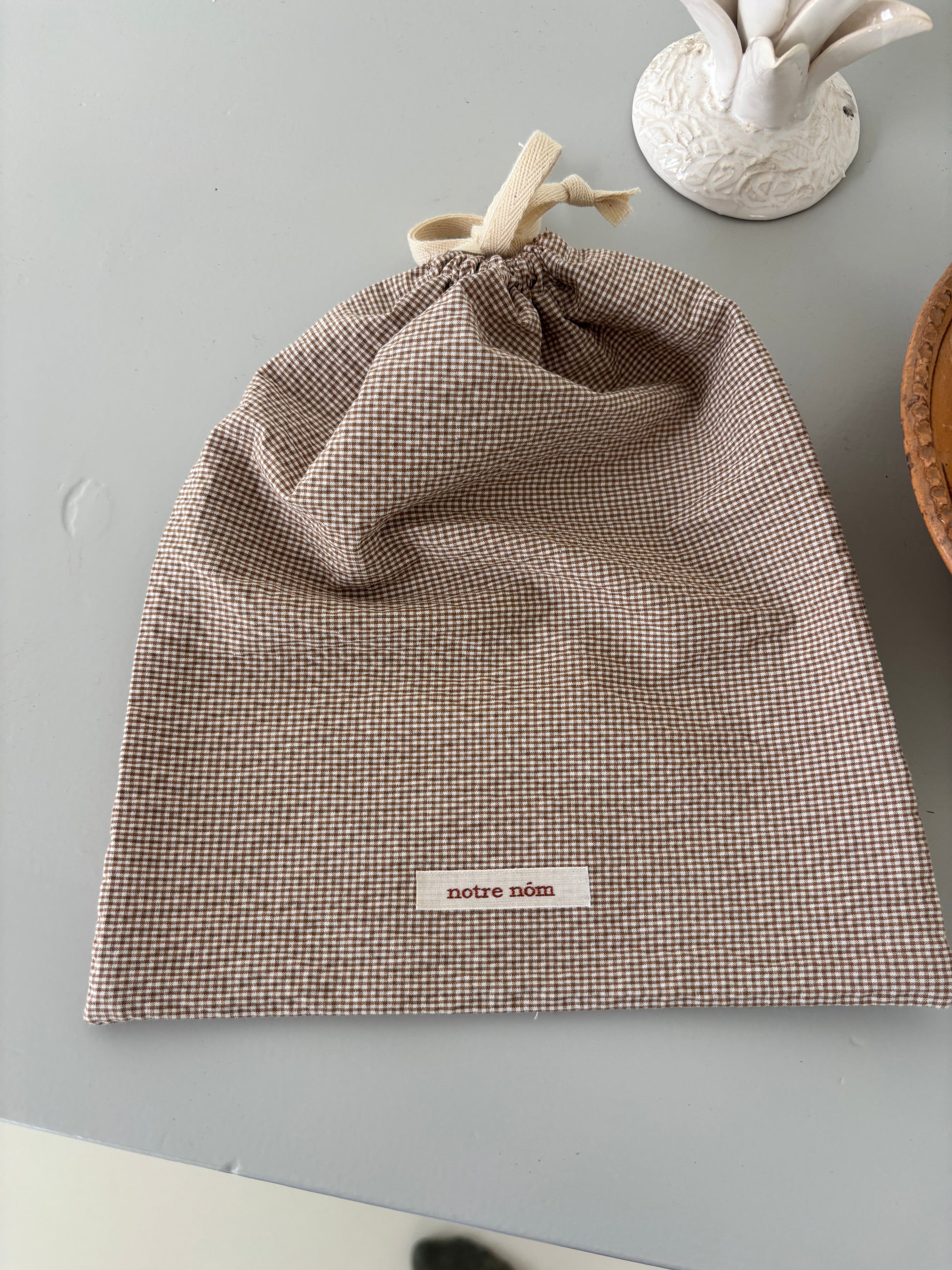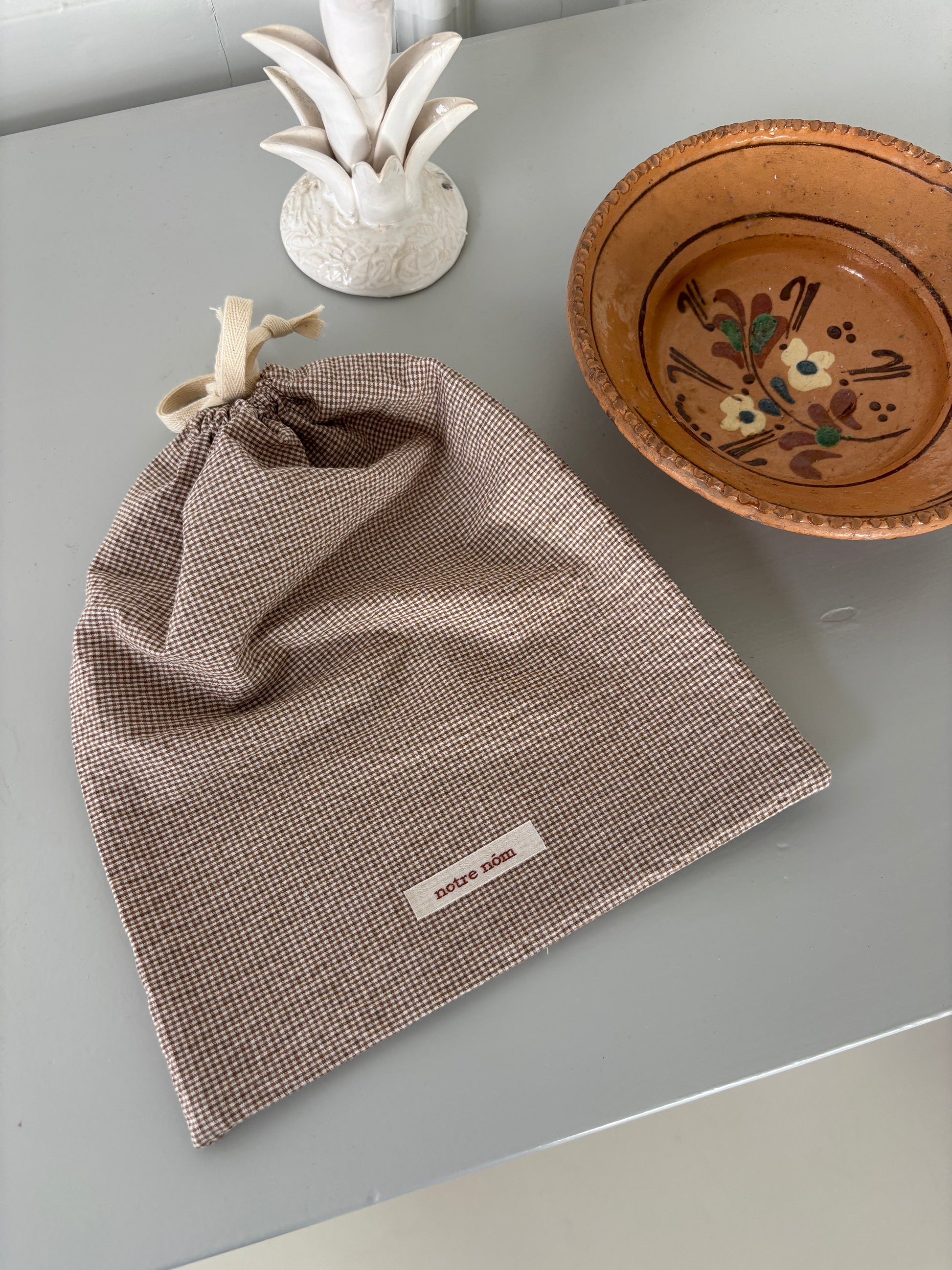 Håndlavet stofpose med snoreluk. I det fineste ternet stof.